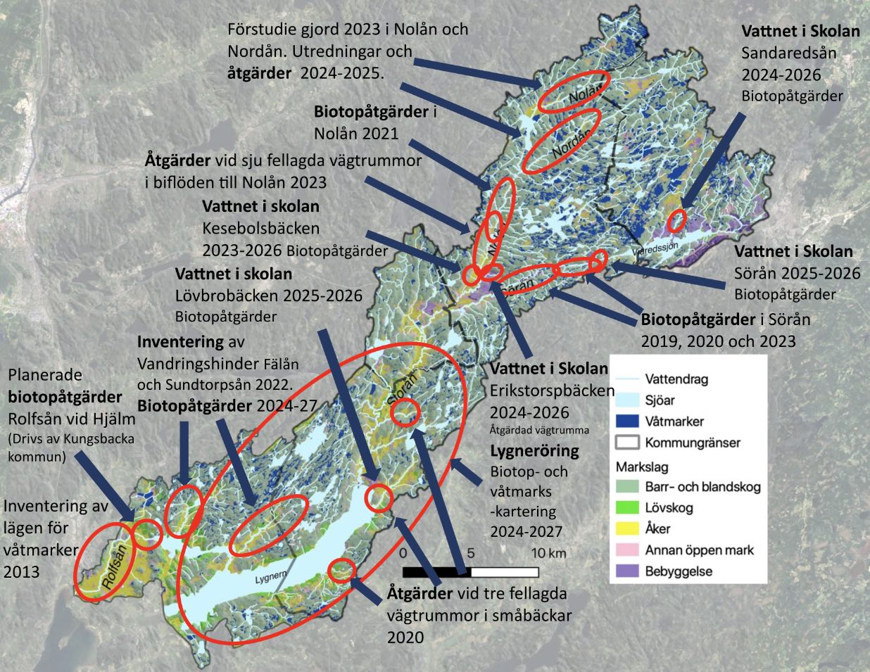 Sedan 2013 har en rad inventeringar och åtgärdsprojekt genomförts på olika platser i avrinningsområdet. Det har skett genom samarbete med markägare, fiskevårdsområdesföreningar, föreningar och andra konsulter. Många av projekten visas på kartan till höger.
